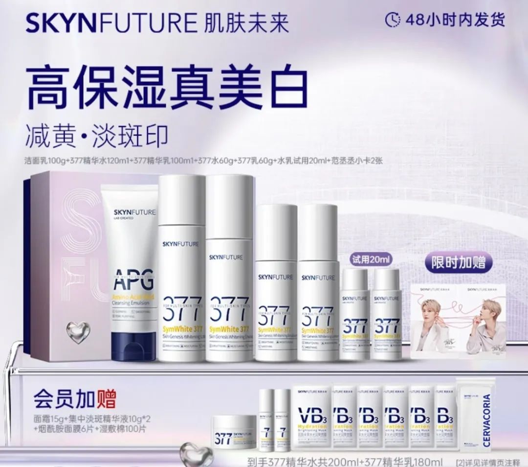 肌肤未来套装产品丰富,涵盖洗面奶、水、乳,加赠同款水和乳,附赠代言人范丞丞小卡两张,商品链接显示拍1享18件,加上299元的超低优惠价,使此套装热卖500W~750W。