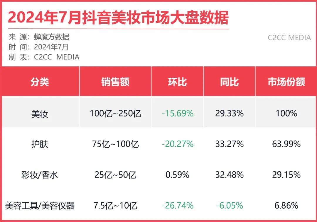 据蝉魔方数据统计,今年7月,抖音美妆总销售额100亿~250亿,环比下降15.69%,同比增长29.33%。