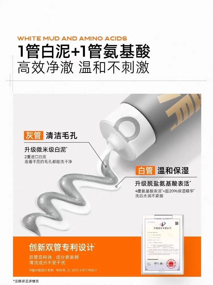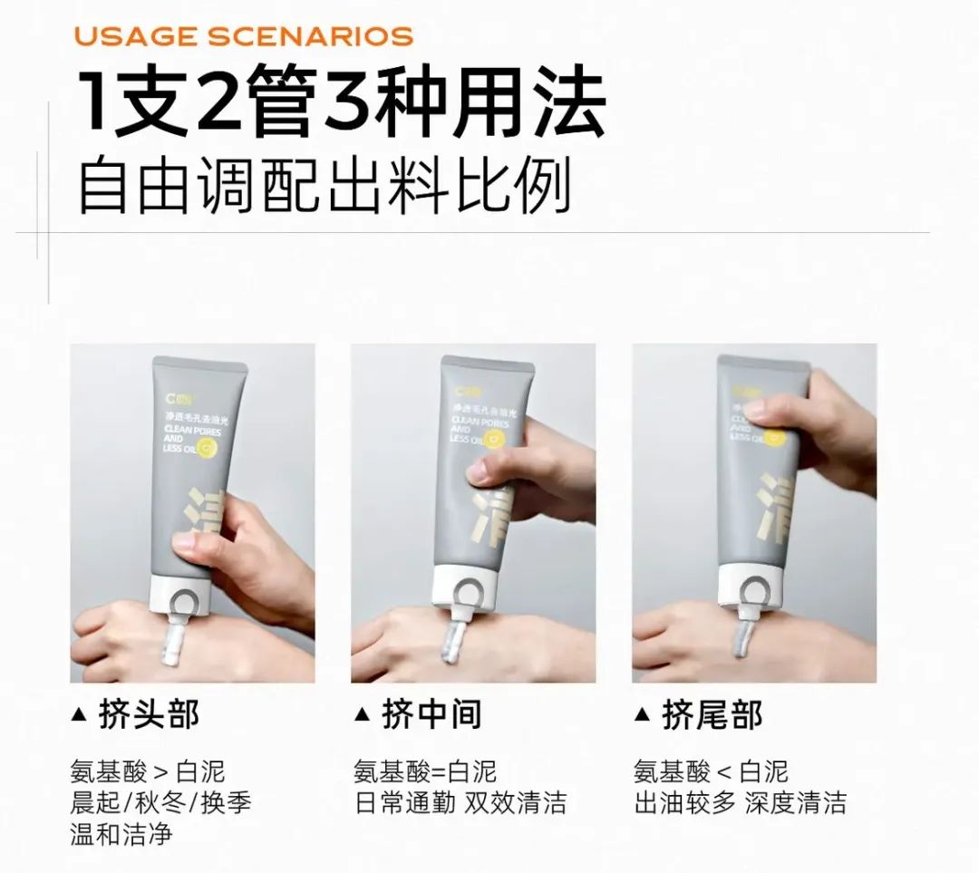而C咖洗面奶为首创双管洗面奶,一管为专攻清洁毛孔的双重微米级白泥,另一管则是温和的脱盐氨基酸洁面,双管可自由调配出料比例,实现1支2管3种用法。