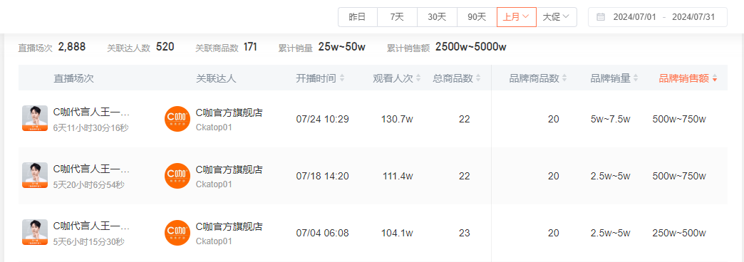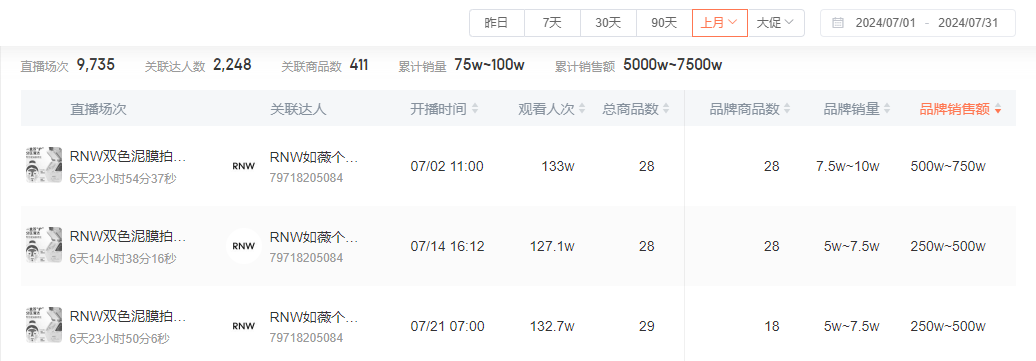 据蝉妈妈显示,RNW如薇和C咖在7月的直播中,品牌销售额前三的直播间,直播时长均在5天以上。
