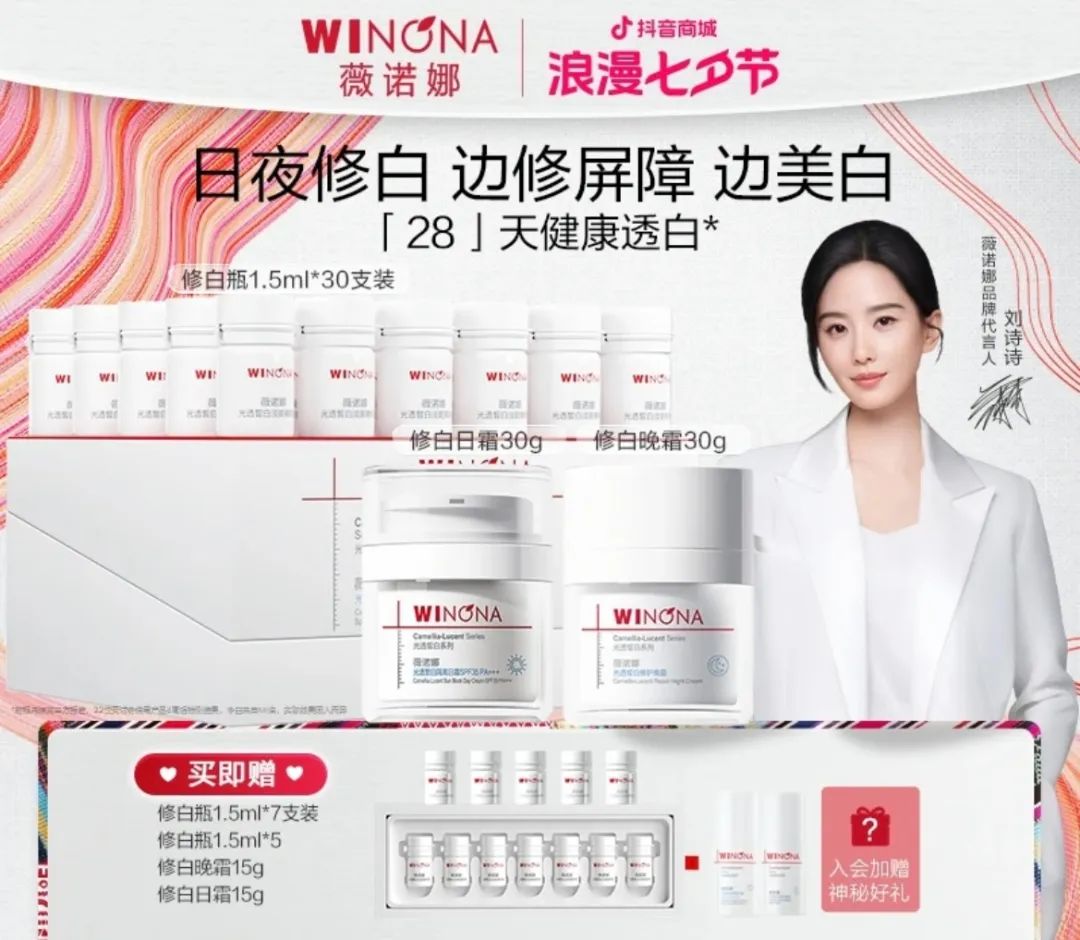 薇诺娜专注敏感肌美白,套装中含有修白日霜、修白晚霜和修白瓶,遵循敏肌美白生物钟,精准分时,白天御黑,晚上修白,同时搭配修白瓶修护屏障,单月卖了750W~1000W。