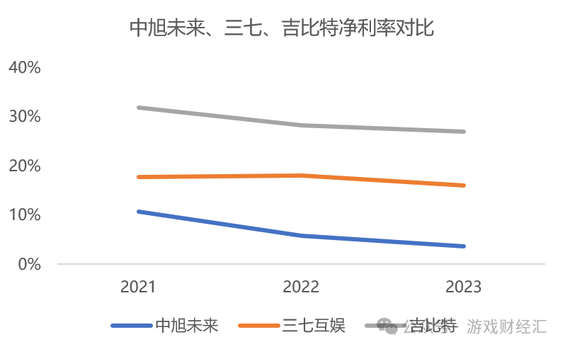 过去三年,中旭未来净利率持续下滑,2023年降至3.6%,远低于吉比特、三七互娱、巨人网络、恺英网络等大厂。