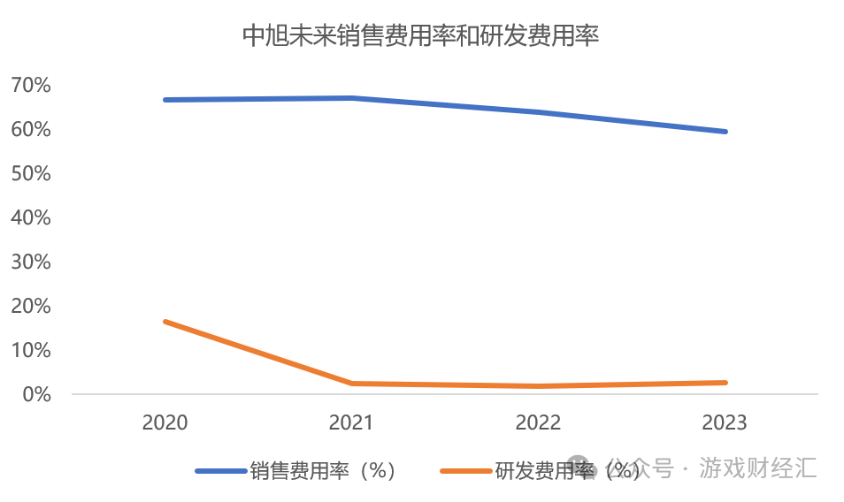 2023年,中旭未来销售费用达38.8亿元,销售费用率接近60%。销售费用率虽有所下滑,但仍维持在较高水平。目前中旭未来的销售费用率超过三七,是国内销售费用率最高的游戏股之一。