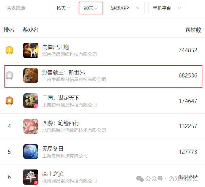 过去90天,《野兽领主:新世界》位列中重度手游APP投放素材榜第二名。