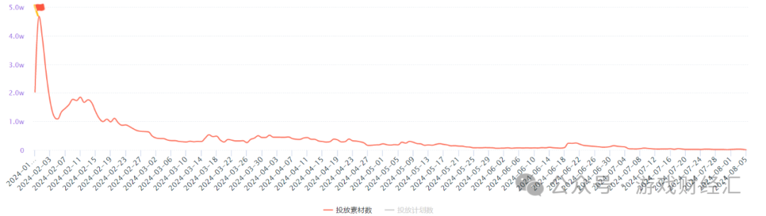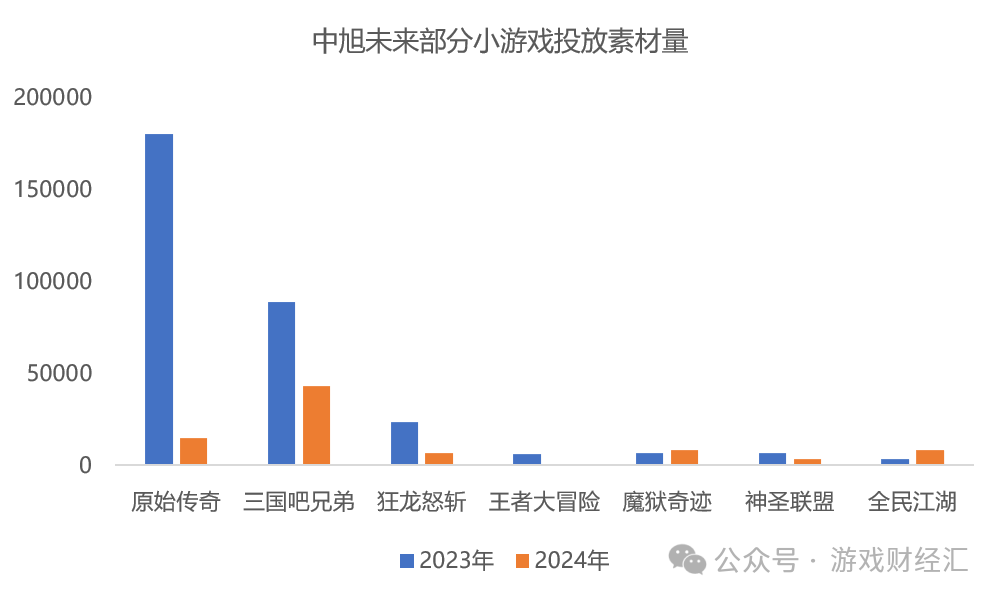 DataEye-ADX的数据显示,中旭未来今年在小游戏的投放策略更为审慎,今年小游戏素材投放量还不到去年全年的30%。特别是去年表现强劲的《原始传奇》,今年的投放量显著减少,从超过18万组降至1.4万组,后者属于中等水平。