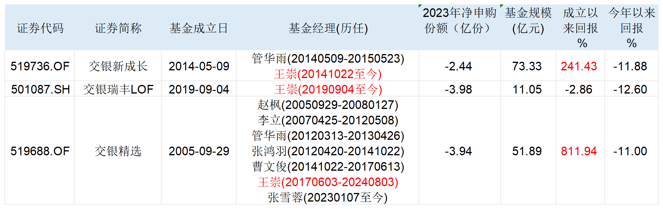 目前,王崇还管理交银新成长、交银瑞丰LOF两只产品,其中交银新成长为代表作。自2014年10月22日接任至今已经接近10年,回报率为241.43%。交银瑞丰LOF自2019年9月4日成立至今一直由王崇独自管理,至今回报率为-2.86%。
