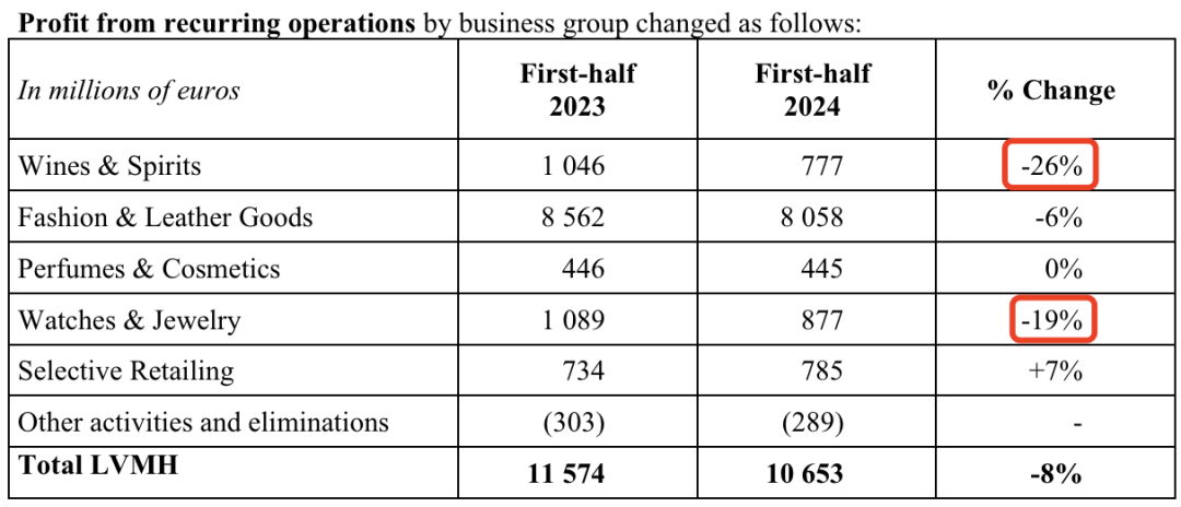 LVMH并未按单一品牌来披露业绩表现,而是按业务线来分。LV、Dior等品牌在内的时装和皮具业务是LVMH集团最大的收入来源。但据财报显示,2024年上半年,该业务利润同比下降达6%,此外,LVMH在葡萄酒和烈酒、手表和珠宝业务也分别同比下降了26%和19%。