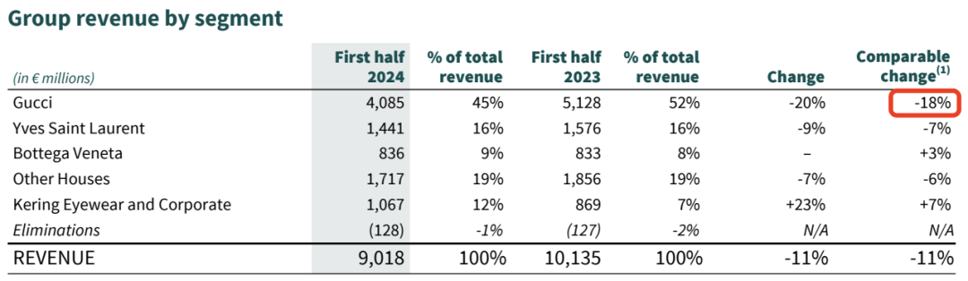 同样“卖不动”的还有Gucci及其母公司开云集团。2024年上半年,Gucci收入大跌20%,开云集团营收同比下降11%,归母净利润同比下降51%。