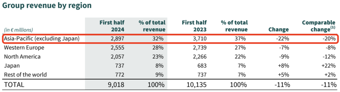 财报解释,主营品牌们营收的下跌,均受到了亚太地区表现下滑的影响。2024年上半年,开云集团营收只在日本一个地区录得8%的正增长,其他地区(西欧、北美、亚太)则全线下跌,其中该集团收入最高的地区亚太区营收同比下降22%,下跌幅度最大,其影响可想而知。