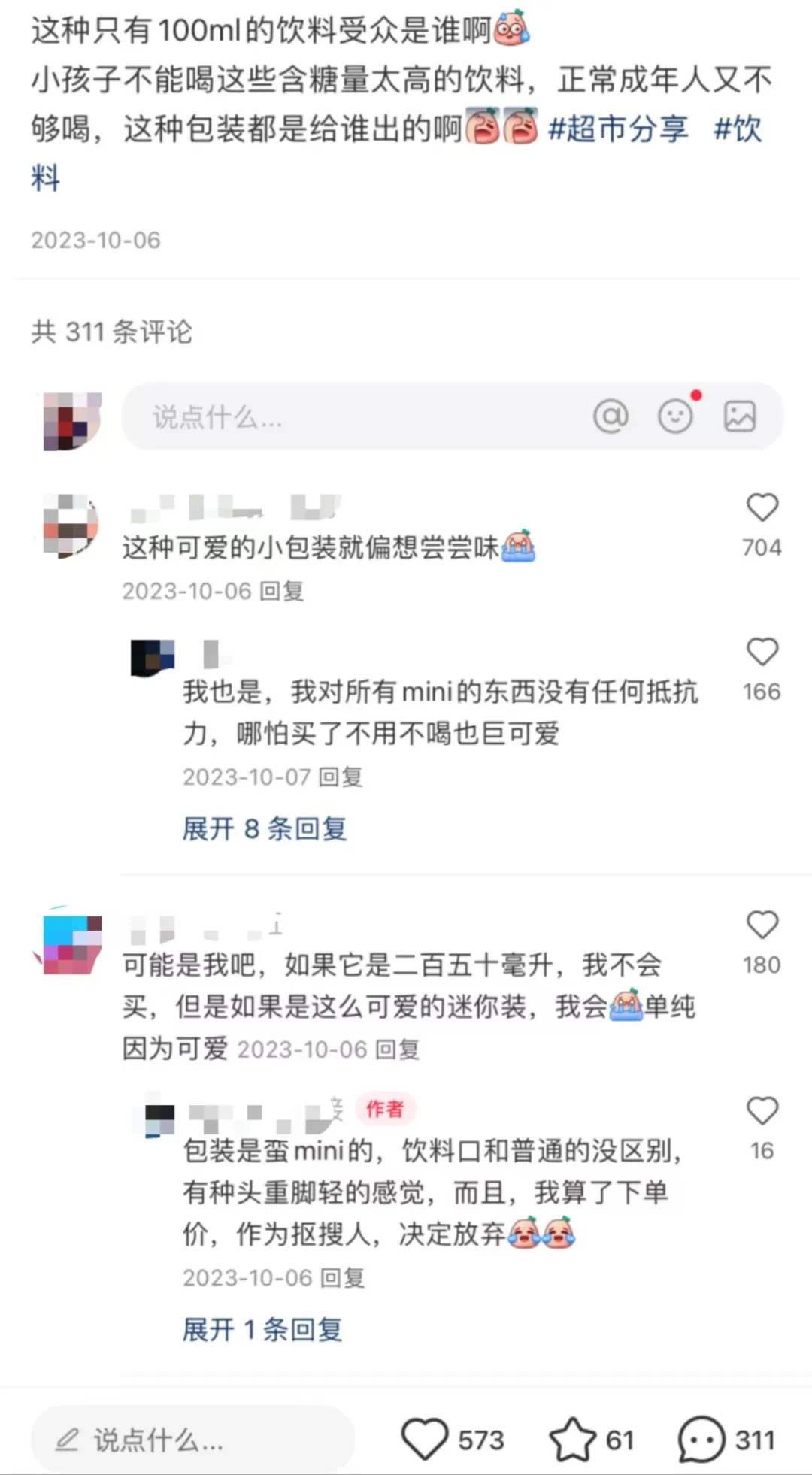 还有网友灵魂发问——100ml的饮料受众到底是谁?不少人评论:“这种可爱的小包装就偏想尝尝味”“哪怕买了不用不喝也超可爱”……