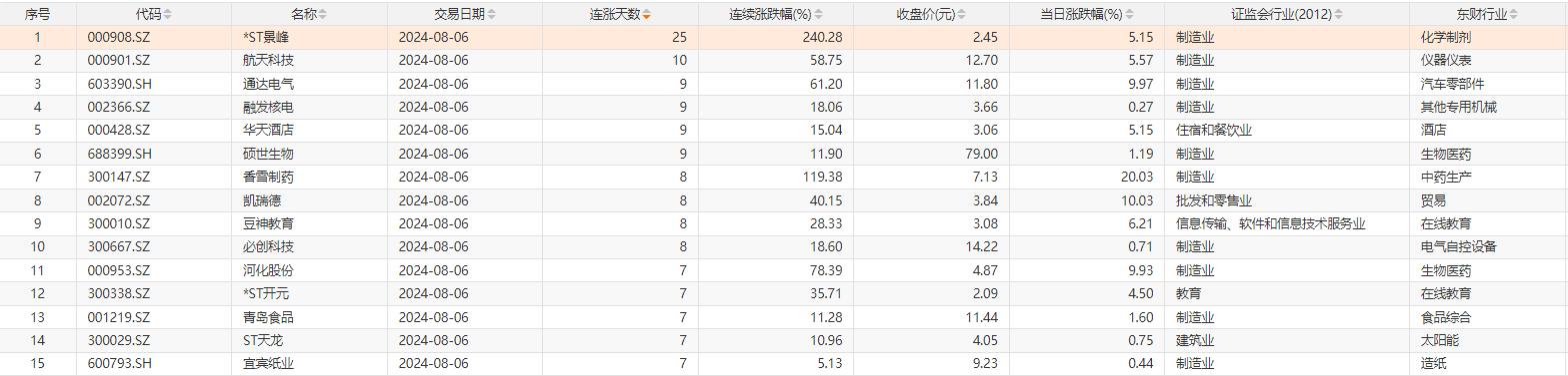 8月6日,Choice数据统计,今日1只个股连续25天上涨,为*ST景峰;1只个股连续10天上涨,为航天科技;此外通达电气、融发核电等4只个股连续9天上涨;香雪制药、凯瑞德等4只个股连续8天上涨。