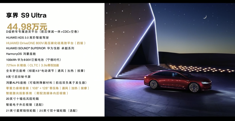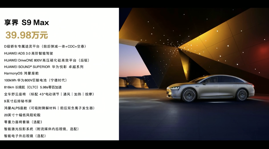 据介绍,享界S9全系标配100kWh华为800V巨鲸电池,MAX版CLTC工况纯电续航里程816km;搭载途灵智能底盘平台,全系标配空气悬架,并首发晕车舒缓模式。