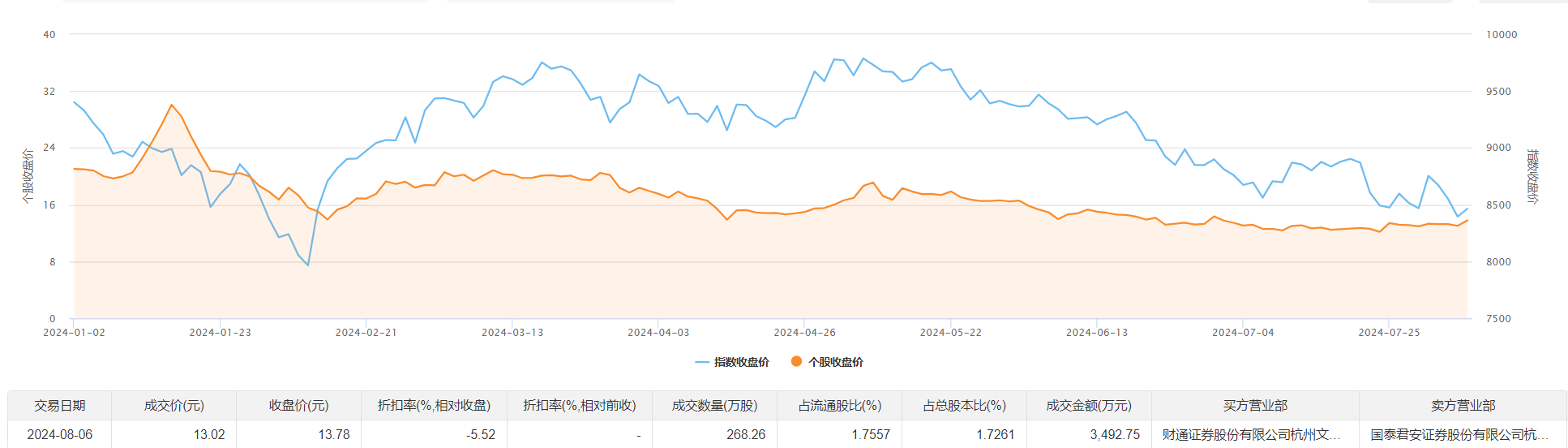 绿康生化8月6日大宗交易成交268.26万股,成交额3492.75万元,占当日总成交额的46.03%,成交价13.02元,较市场收盘价13.78元折价5.52%。