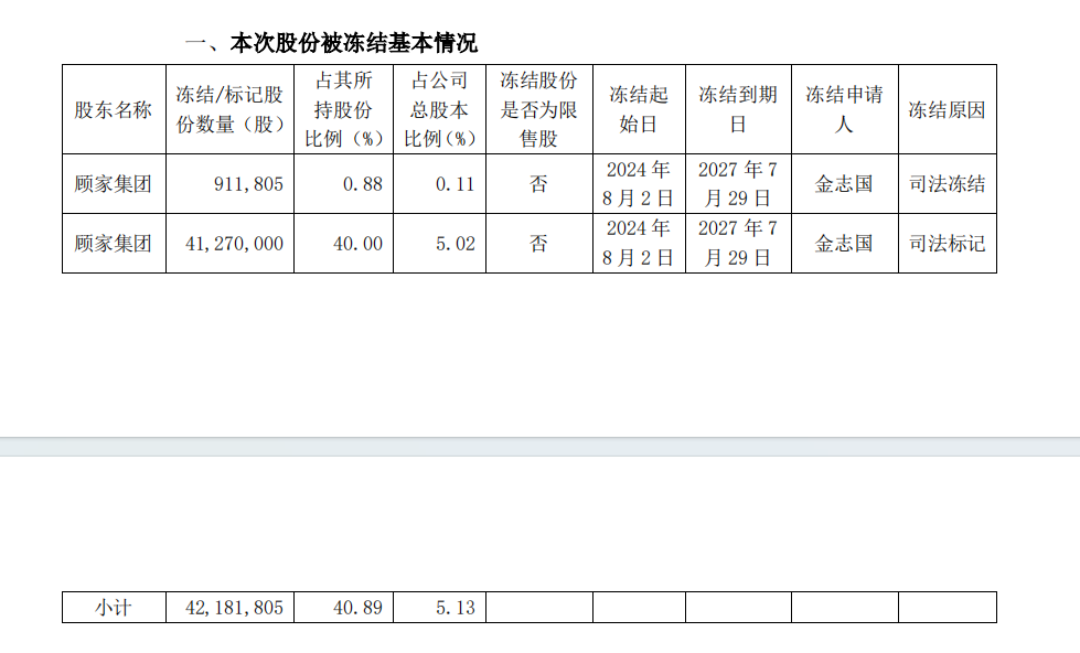 杭州中院根据相关诉前调的《民事裁定书》等文书对顾家集团采取了诉前财产保全措施,并冻结了顾家集团所持顾家家居的4218.18万股股份(市值约为10.56亿),该股份占顾家家居总股本的5.13%,占其所持有股份的40.89%。