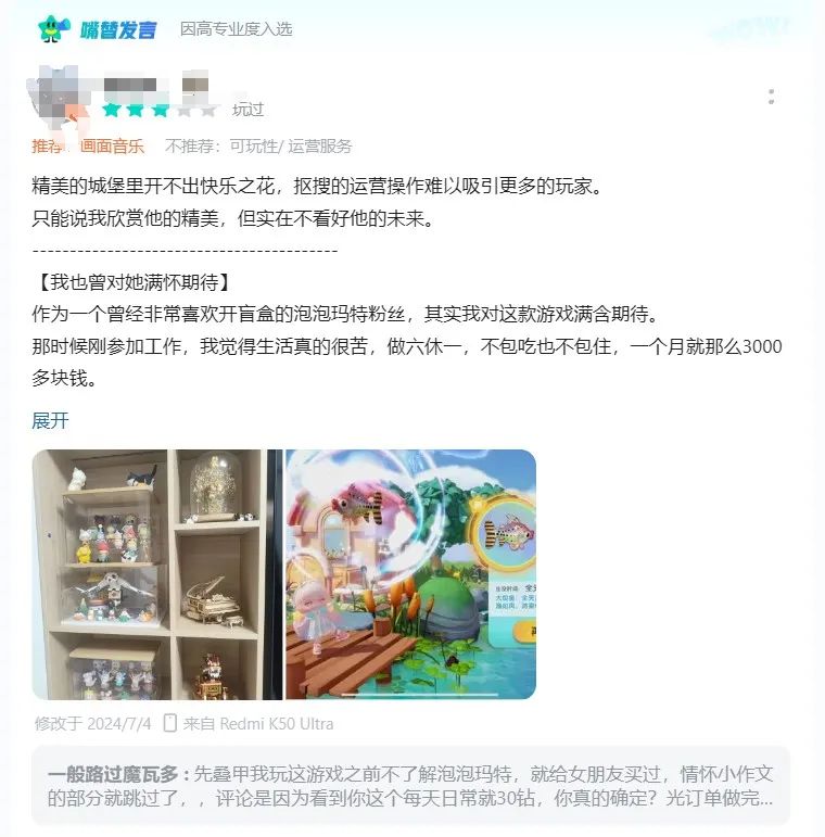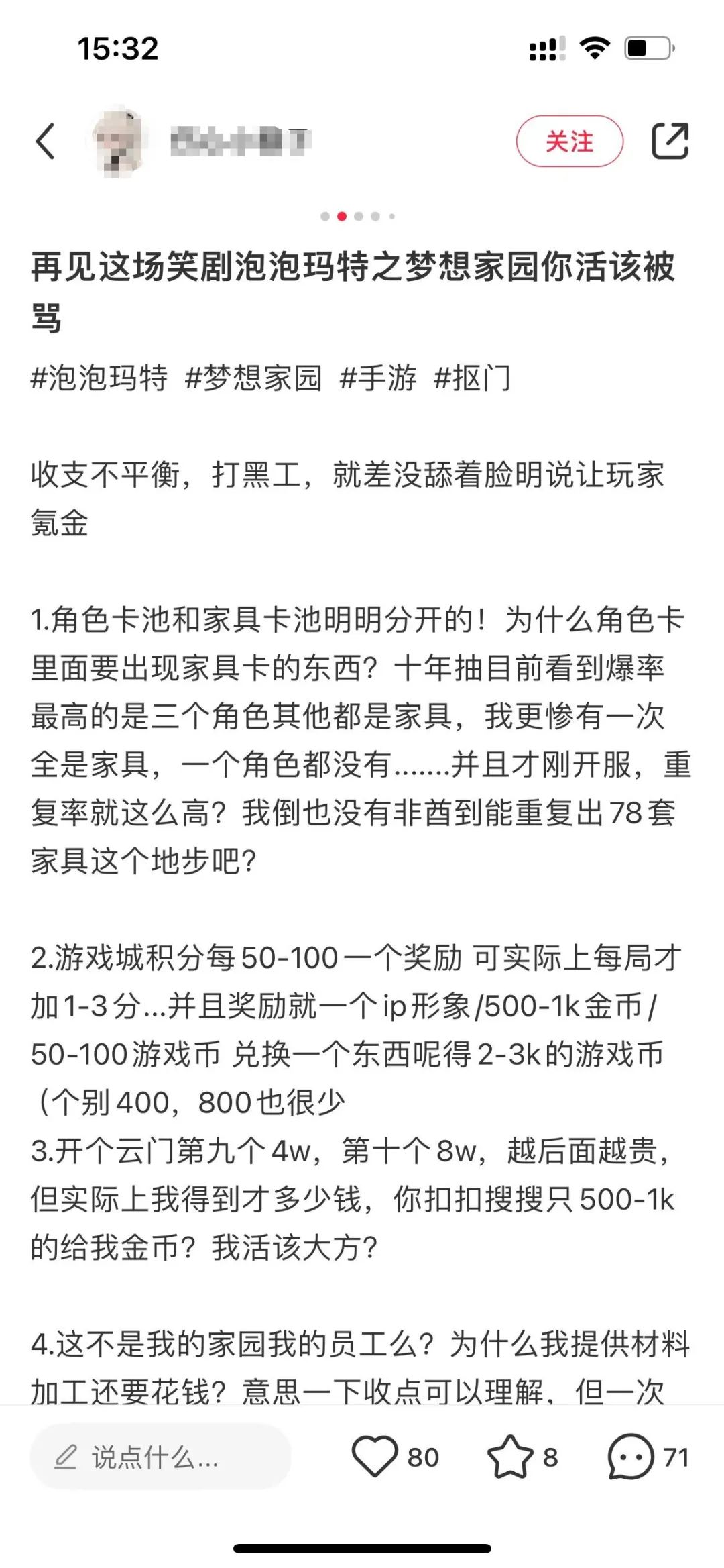 可能游戏从业者玩到《梦想家园》时会略感意外,国内米哈游、网易、心动游戏等游戏公司在布局“动森Like”游戏,没想到泡泡玛特的自研项目先公测了。然而,游戏公司在游戏研发、游戏运营方面所具备的优势,恰恰是作为IP公司的泡泡玛特自研游戏所缺乏的,这也使得《梦想家园》在正式上线后没多久便暴露出诸多缺点。