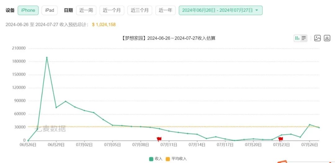 游戏上线1个月后,在7月25日迎来的大版本更新“血色玫瑰”也并未对游戏流水带来明显拉升,《梦想家园》的走向基本已定。