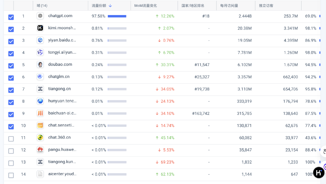 投放效果如何呢?据最新数据(7月),国内主流大模型(AI对话)的数据统计,月活超千万的,只有Kimi和文心一言两家;超百万的也只有4家。而月活有24亿体量的,全球也只有ChatGPT一家。