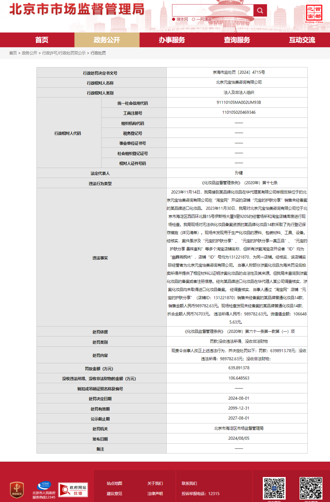 近日,北京元宝怡美咨询有限公司(以下简称“元宝怡美”),因销售未经备案的进口化妆品,违反了《化妆品监督管理条例》第十七条的规定,被北京市市场监督管理局处罚没共计746.54万元。