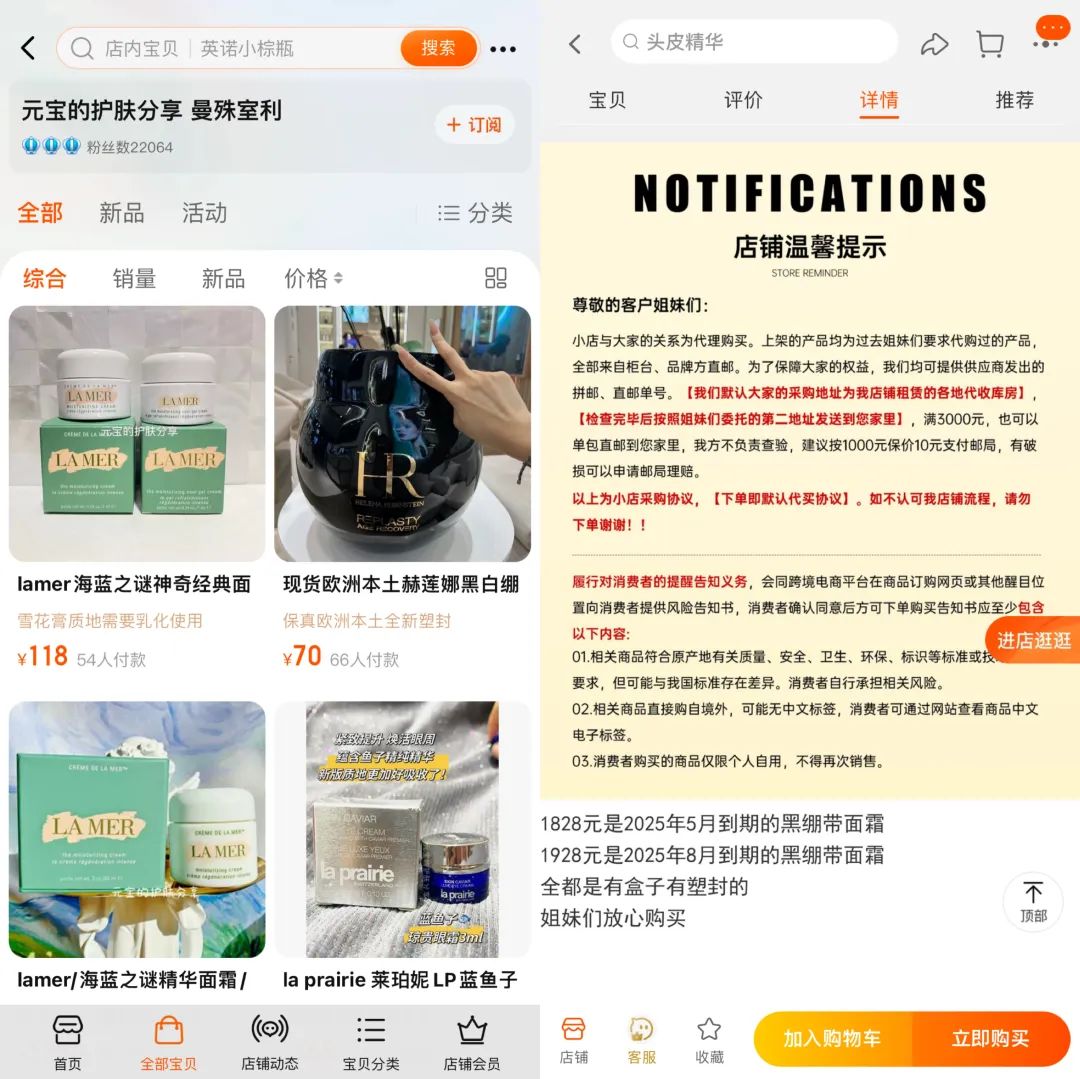 据淘宝商家信息显示,“元宝的护肤分享 曼殊室利”是一家8年老店,在淘宝上拥有2万粉丝,所售产品以进口化妆品居多,涵盖护肤、护发、香水、彩妆等不同品类,且价格相对较便宜。