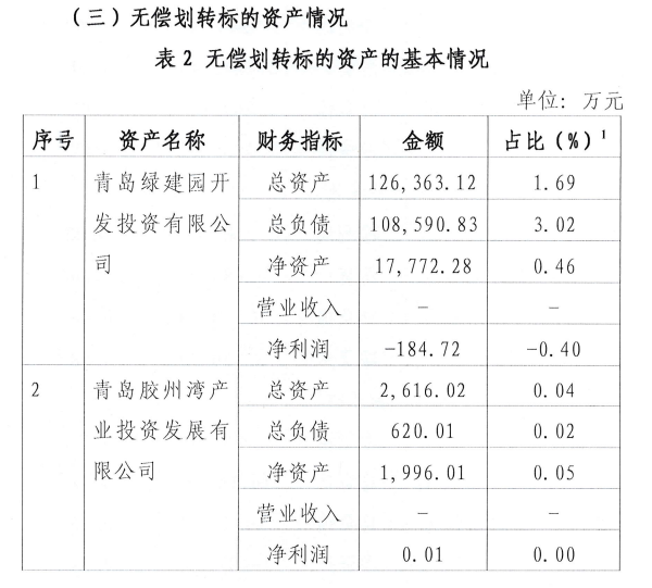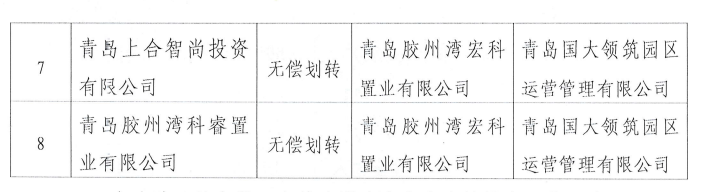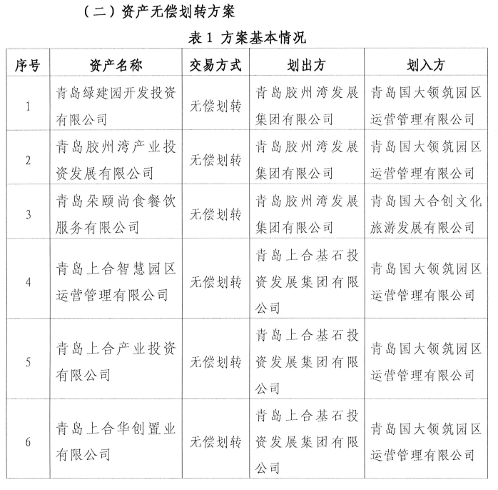 具体无偿划转资产情况为:将青岛绿建园开发投资有限公司、青岛胶州湾产业投资发展有限公司从青岛胶州湾发展集团划入青岛国大领筑园区运营管理有限公司,将青岛朵颐尚食餐饮服务有限公司从青岛胶州湾发展集团划入青岛国大合创文化旅游发展有限公司,将青岛上合智慧园区运营管理有限公司、青岛上合产业投资有限公司、青岛上合华创置业有限公司从青岛上合基石投资发展集 团有限公司划入青岛国大领筑园区运营管理有限公司,将青岛上合智尚投资有限公司、青岛胶州湾科睿置业有限公司从青岛胶州湾宏科置业有限公司划入青岛国大领筑园区运营管理有限公司。