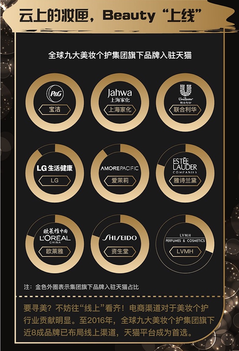 根据天猫美妆联合第一财经商业数据中心(CBNData)发布的《2017中国美妆个护消费趋势报告》,从品牌看,目前已有超过3000个美妆品牌在天猫开设了旗舰店。以美妆集团角度看,全球九大美妆集团目前都有入驻天猫,其中宝洁、上海家化、联合利华这样主打日化快消类产品的集团已实现旗下品牌在天猫商城的100%入驻率。而LVMH、欧莱雅、雅诗兰黛、爱茉莉、资生堂、LG等集团因为牵扯香水、口红等不易于开展线上试妆体验的品类,同时也有品牌定位等因素的考量,只进驻了部分品牌和产品,但入驻比例也都达到75%。