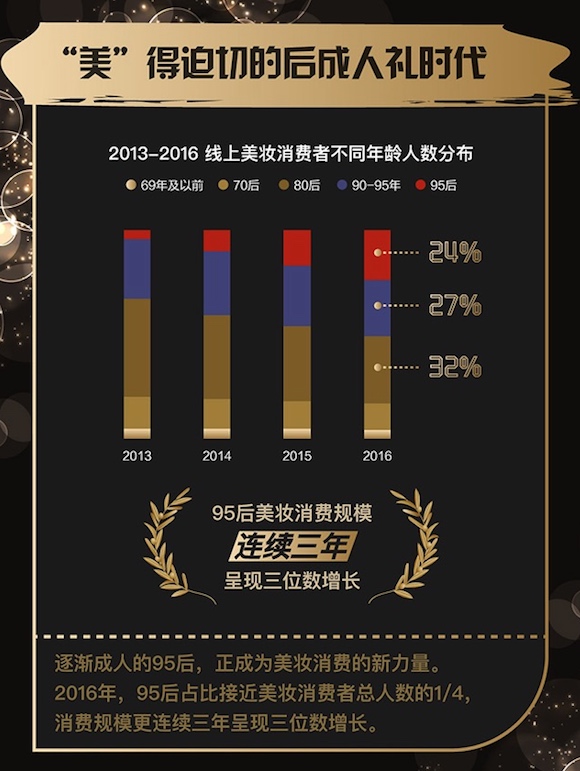 但品牌更看重的似乎是在这些顾客中的年轻人群体。他们正以飞快地速度成为化妆品消费主力。参考来自上述《2017中国美妆个护消费趋势报告》的数据,从2013年到2016年,95后的线上美妆消费规模连续三年呈现三位数的增长。在2016年时,90后和95后一同贡献的销量已经超过整体线上美妆消费规模的一半。