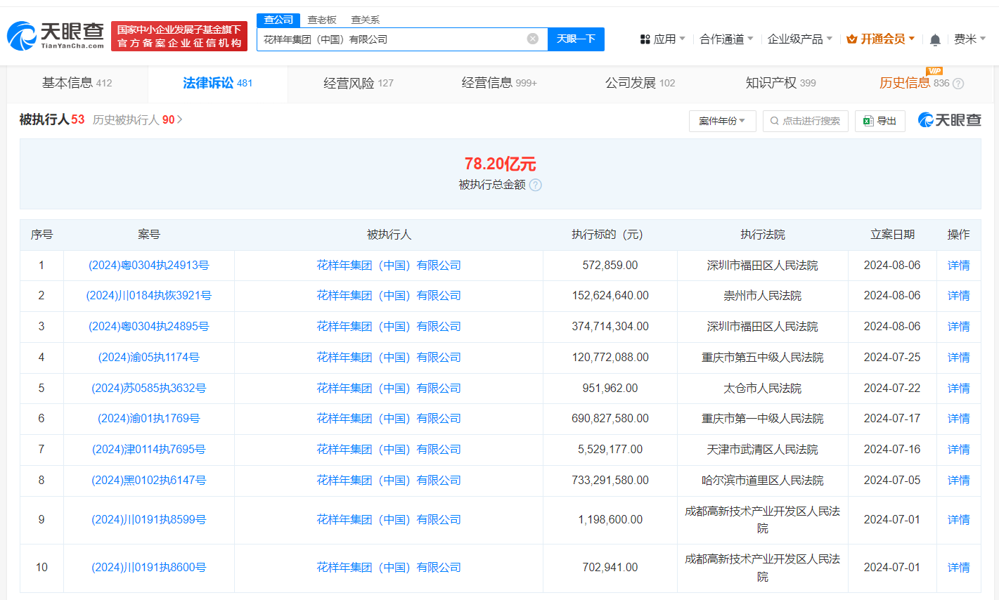 天眼查法律诉讼信息显示,8月6日,花样年集团(中国)有限公司新增3条被执行人信息,执行标的合计5.2亿余元,涉及建设工程施工合同纠纷部分等案件,部分案件被执行人还包括深圳市花好园房地产经营服务有限公司、成都市花样年房地产开发有限公司等,执行法院为深圳市福田区人民法院、崇州市人民法院。风险信息显示,花样年集团(中国)有限公司现存50余条被执行人信息,被执行总金额超78亿元。此外,该公司还存在多条限制消费令、失信被执行人(老赖)及终本案件信息。