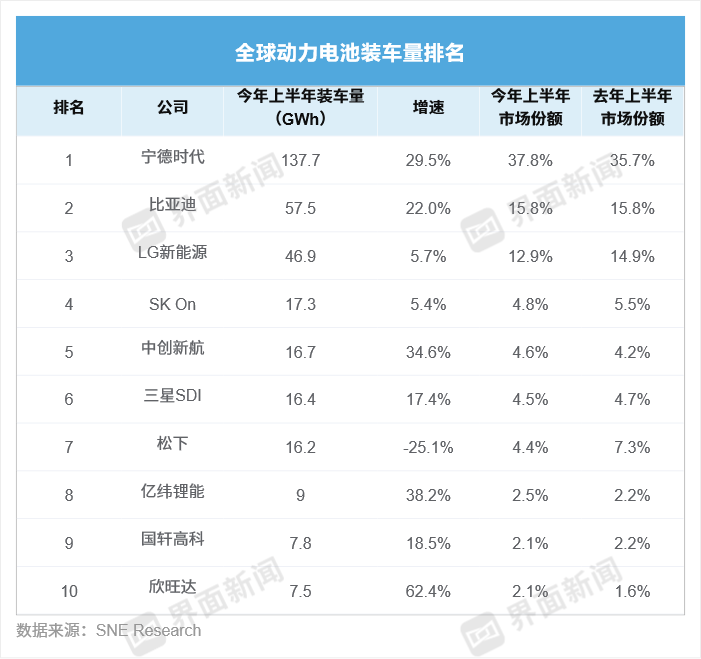 全球前十榜单内的另外三家中国企业,亿纬锂能(300014.SZ)、国轩高科(002074.SZ)和欣旺达(300207.SZ)位列第八到十名。六家中国企业上半年的总市场份额达64.9%,较去年全年的63.5%又有了进一步的提升。