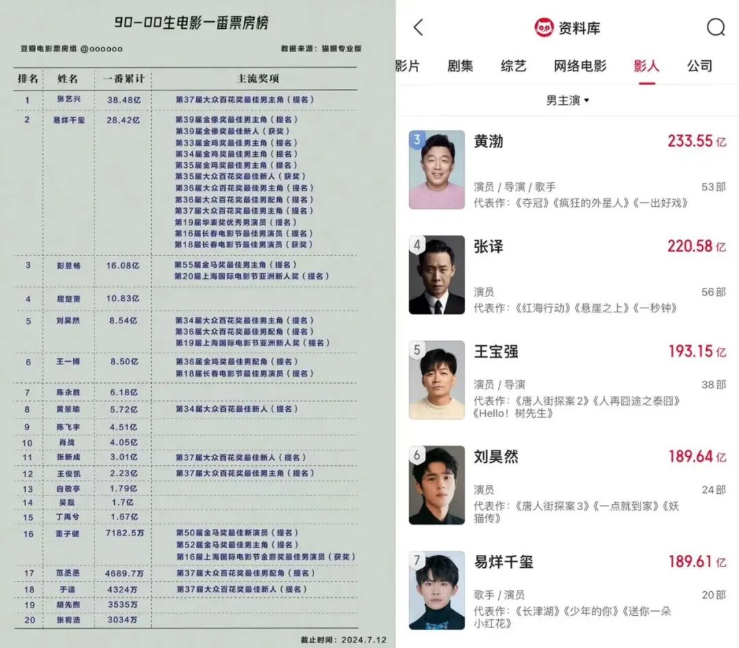 “张艺兴一番票房TOP1”的微博热搜,源自粉丝将70、80生排除在外,统计了90、00生的票房,张艺兴凭借《孤注一掷》一部电影就坐上头名。话题一出,自然招来别家粉丝质疑。比如,易烊千玺粉丝就不满双男主署名的《满江红》未被统计在内。