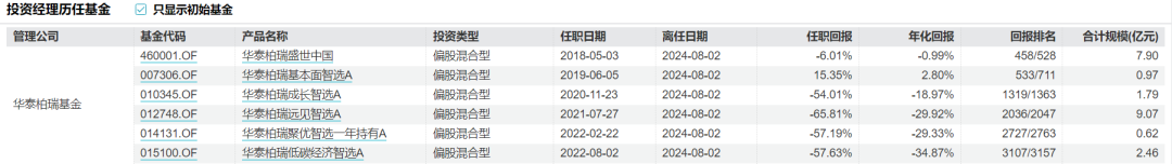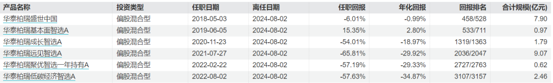 牛通在管期间其余4只亏损的产品分别是,华泰柏瑞盛世中国、华泰柏瑞成长智选A、华泰柏瑞聚优智选一年持有A、华泰柏瑞低碳经济智选A,华泰柏瑞盛世中国亏损低于10%,为-6.01%,其余3只任职回报亏损均超50%,分别为-54.01%、-57.19%、-57.63%。