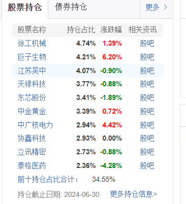 以华泰柏瑞远见智选混合为例。独角金融梳理发现,二季度,该产品重仓的个股分别为徐工机械、巨子生物、江苏吴中、天 科技、东芯股份、中金黄金、中广核电力、协鑫科技、立讯精密、泰格医药。