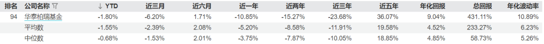走过19年风风雨雨,最近三年成绩却不尽人意——据wind数据,华泰柏瑞近一年业绩为-10.85%,行业平均数为-5.2%;近2年整体收益为-15.27%,行业平均数为-8.58%,近3年整体收益为-23.68%,低于行业的平均数-11.91%。