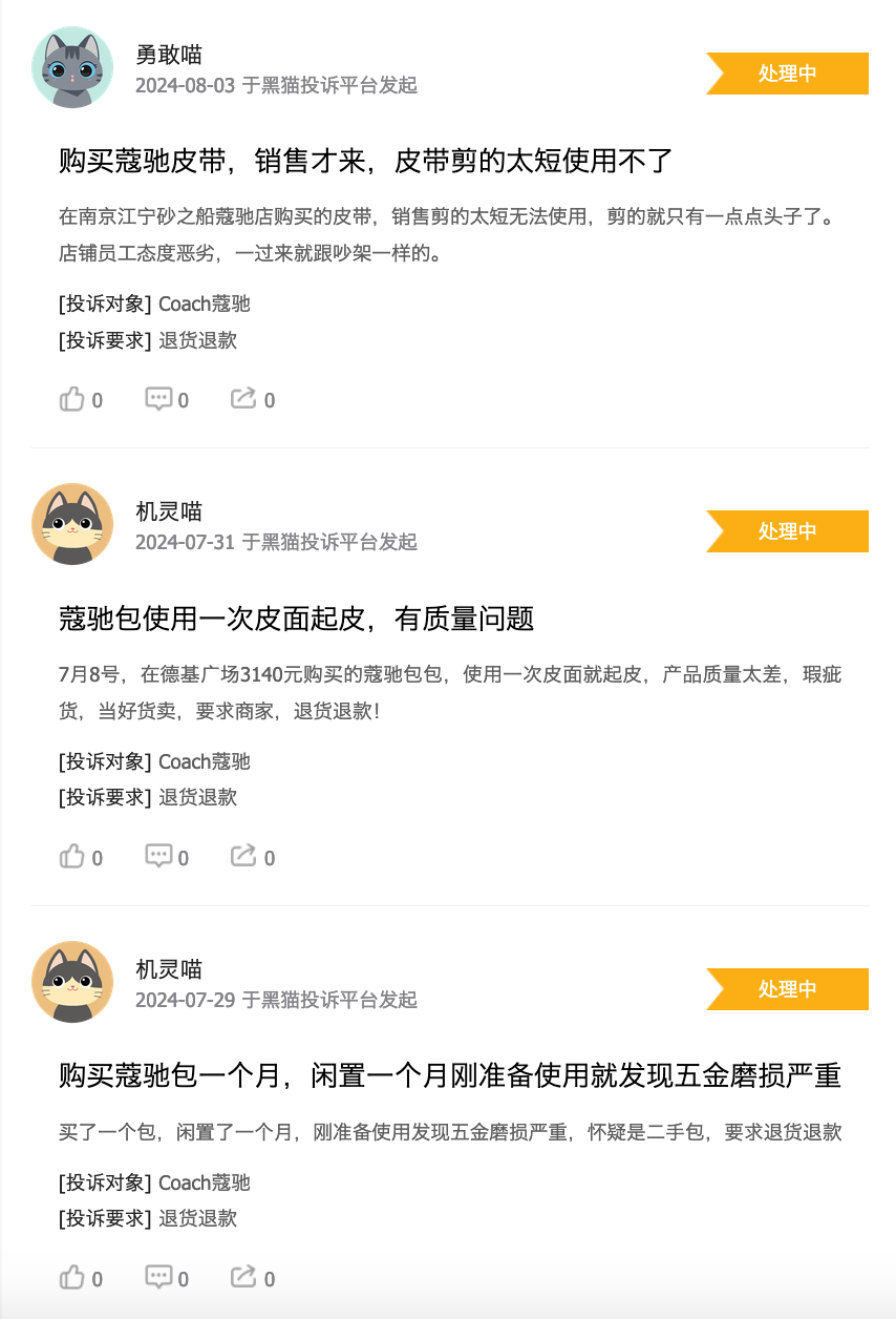 在消费保平台,蔻驰也曾遭到消费者投诉,近30天内获得了2次投诉,分别与售后三包、质量问题有关,目前相关投诉仍在处理过程中。