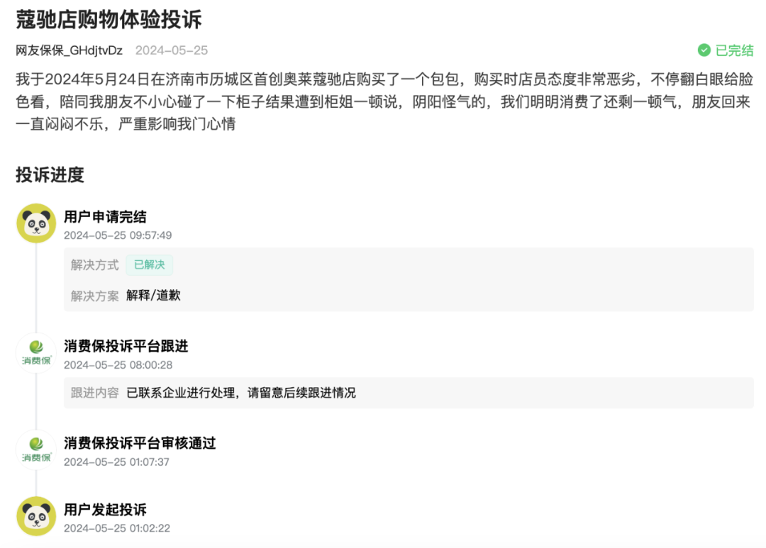 在今年5月份的一起投诉中,有消费者投诉蔻驰店购物体验问题,当时这位网友在济南历城区首创奥莱蔻驰店购买包包时,认为店员态度非常恶劣,不停翻白眼给脸色看。