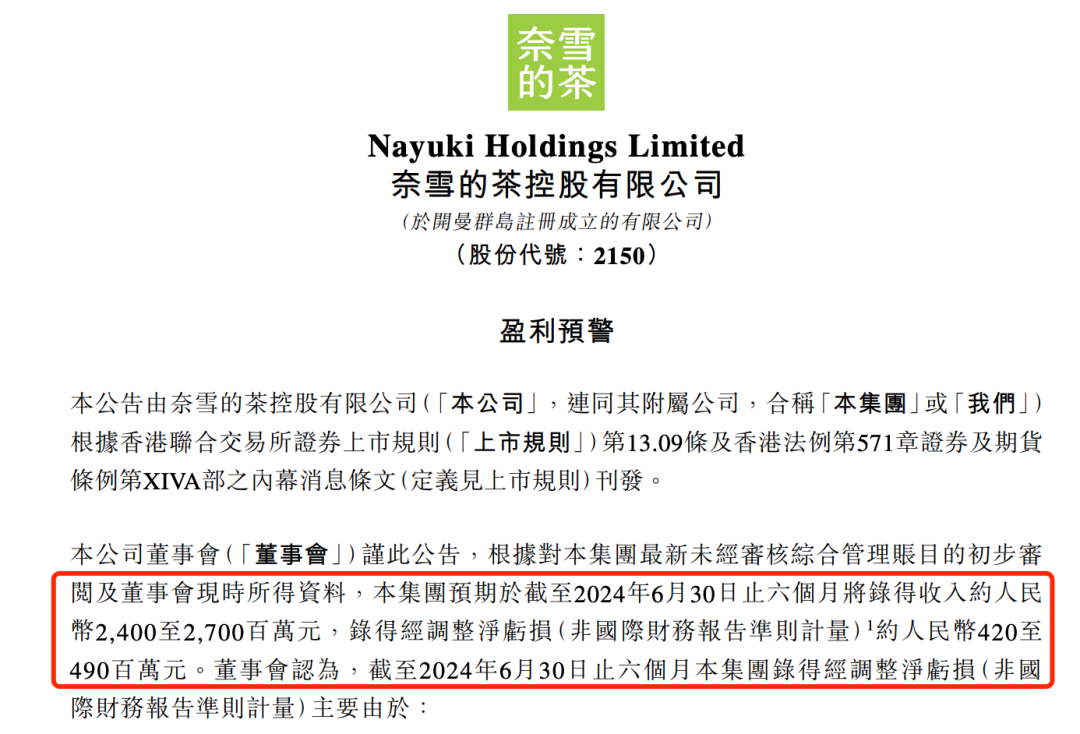 据奈雪的茶业绩预警,今年上半年预计收入约为24.00亿元-27.00亿元;经调整净亏损为4.20亿元-4.90亿元,2023年同期,其经调整净利润为7020万元,同比下跌698.29%-798.01%。