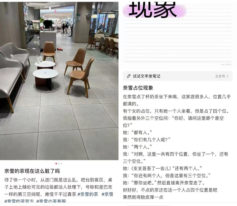 此外,打着第三空间的奈雪也迎来便利店、咖啡店、奶茶店等不同业态、同目标客群的争夺战。另,社交平台上也存在对奈雪“第三空间”环境或管理不满的论调。