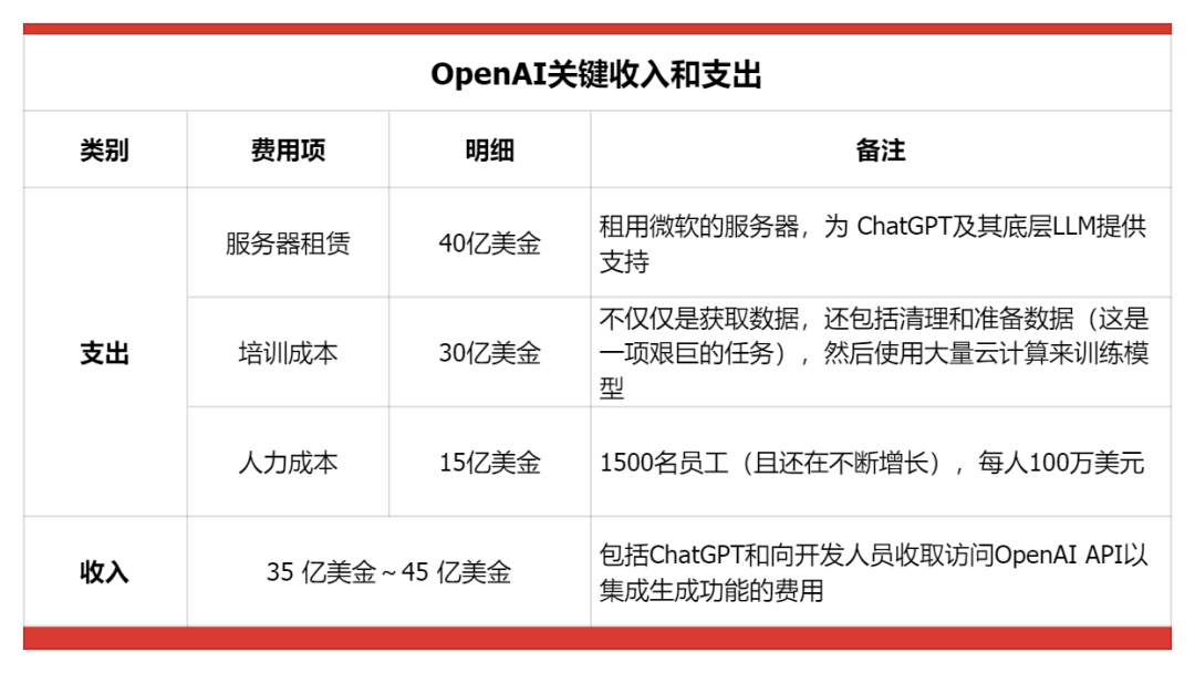 美国科技媒体The Information做过一个测算,按照OpenAI的支出,其2024年的费用可能高达85亿美元,即算上35亿美元的收入,其2024年的亏损也将高达50亿美金。