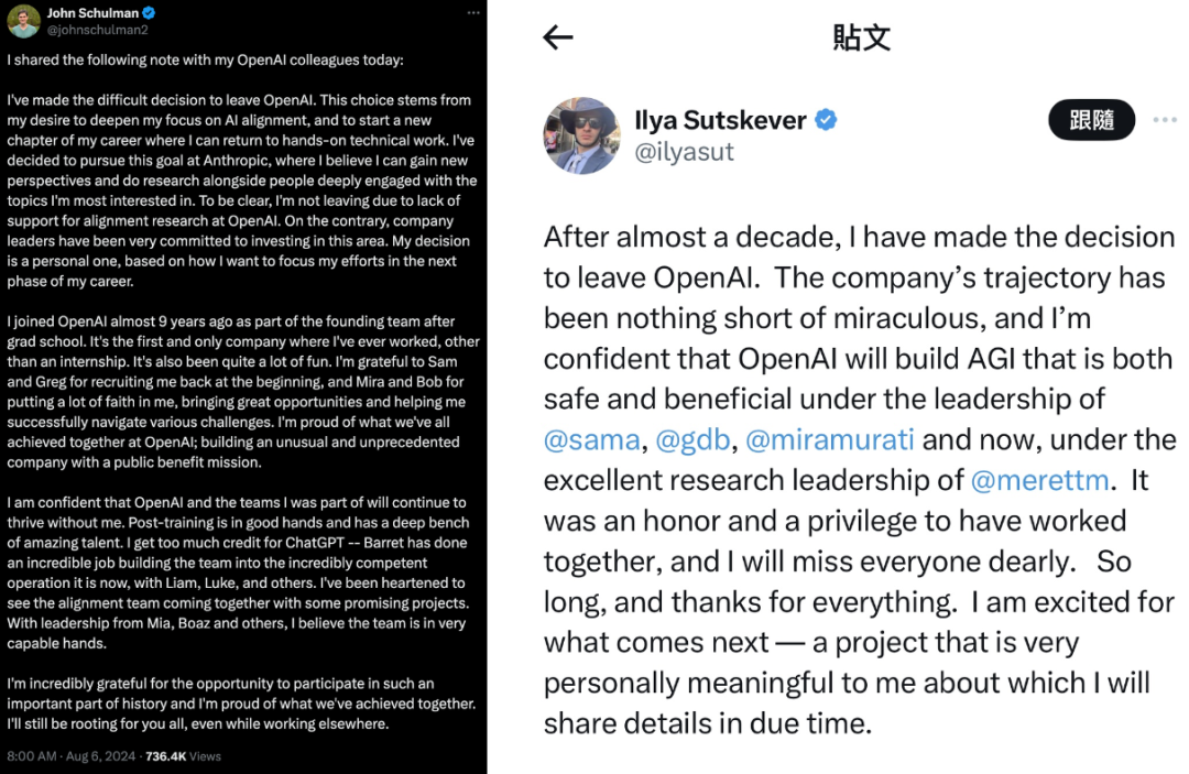 8月6日,OpenAI联合创始人John Schulman在X上正式宣布离职,他的离职感言文风与3 个月前官宣离职的Ilya Sutskever如出一辙。