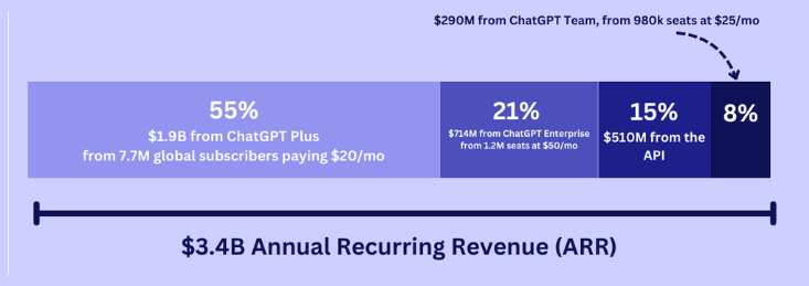 其中面向普通用户的ChatGPT Plus订阅收入约19亿美元,占总收入的55%;面向大型企业客户的ChatGPT Enterprise贡献约7.44亿美元的收入,占比21%;面向中小企业和团队用户的ChatGPT Team贡献约2.9亿美元收入,占比约8%;最后API接口服务贡献约5.1亿美元收入,占比15%。