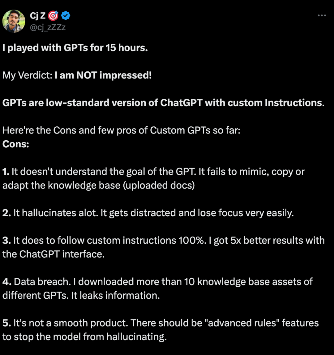 ▲图:一位X用户直言,GPTs有一些缺陷,比如会导致幻觉和数据泄露。