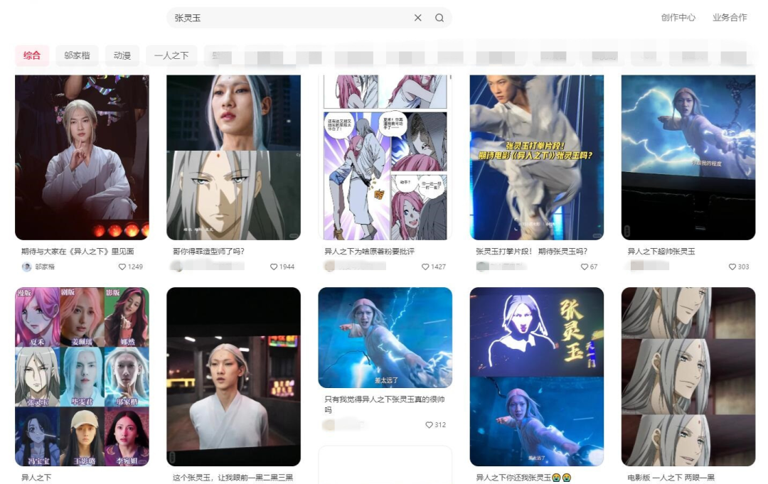 可能也是在这种“cos剧”做法经验下,男频剧《烈焰》《少年歌行》的选角都会利用复制原漫一般的妆造,甚至与原漫一样的拍摄分镜做到人物的还原。剧版《异人之下》中张灵玉、夏禾也直接用“coser假发”让演员更贴角色。