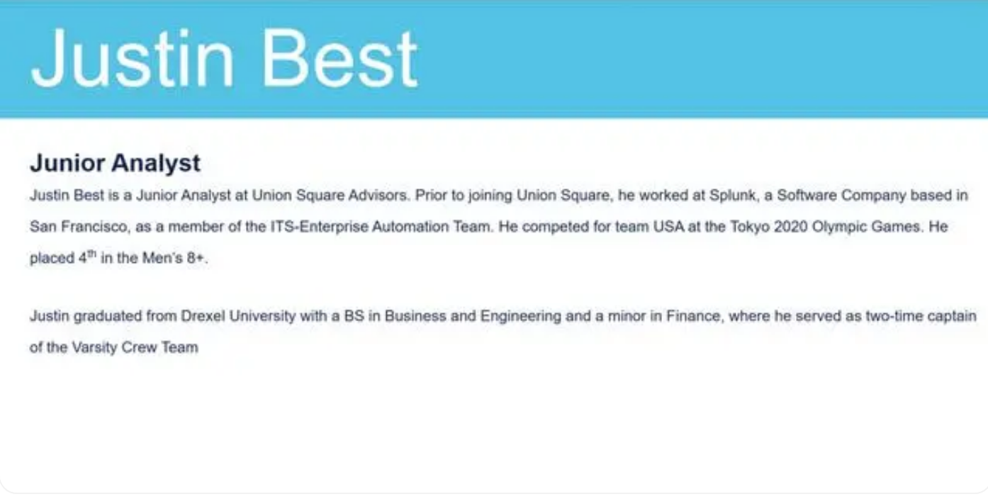 根据履历,贾斯汀·贝斯特在费城德雷塞尔大学学习商业、工程和金融,在担任过其他几个分析师职位后,于2021年11月来到联合广场顾问公司。