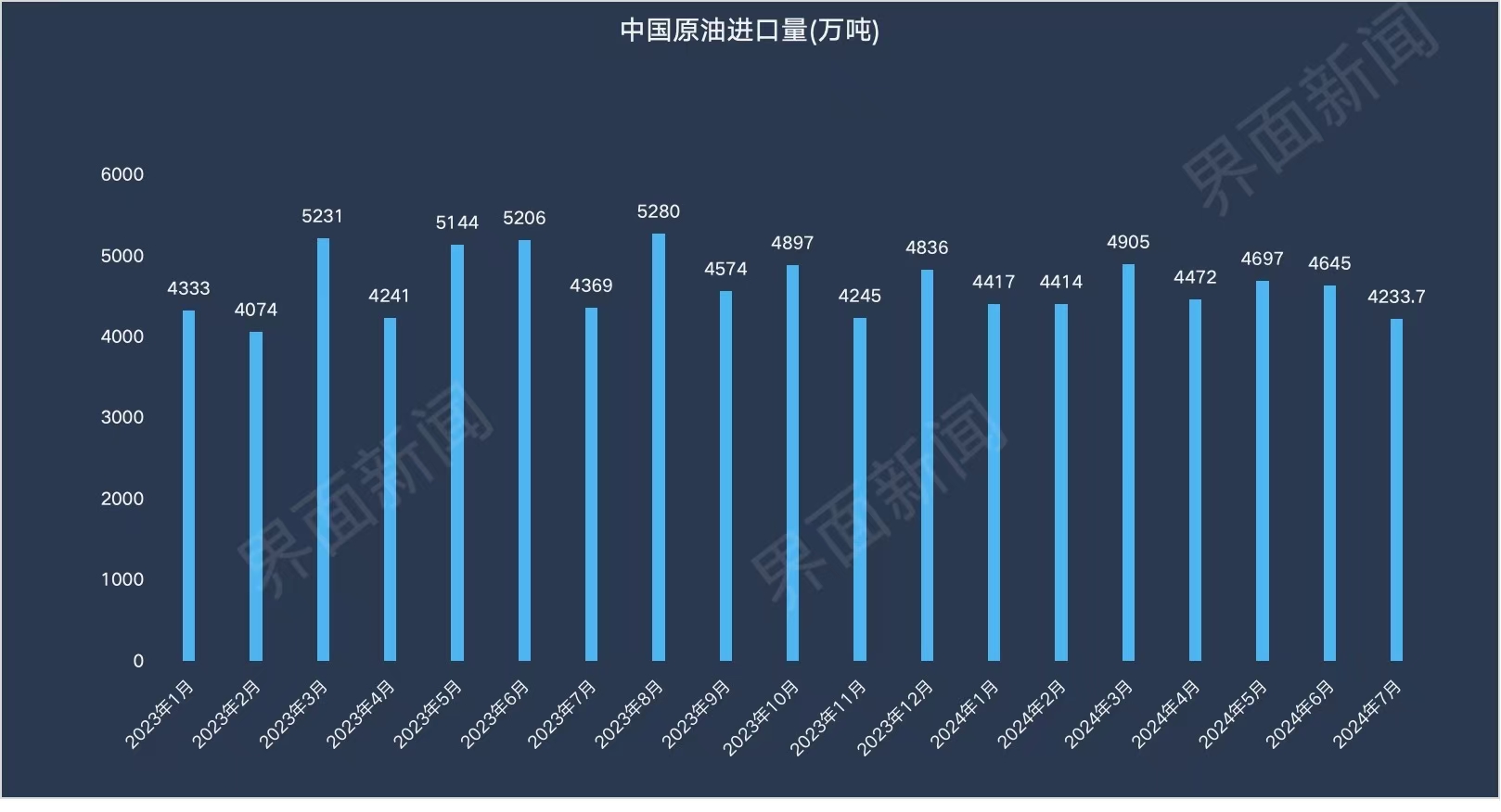 界面新闻梳理海关总署数据发现,7月原油进口量创下自去年3月以来月度进口量新低。去年2月,中国原油进口量为4074万吨,3月升至5231万吨。