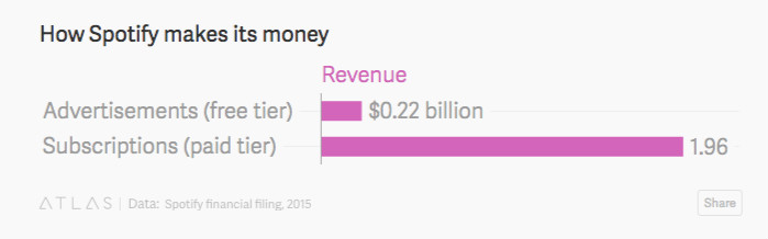 但是,数据显示,2015年,Spotify在营收21.8亿美元的情况下,依然净亏损1.94亿美元。