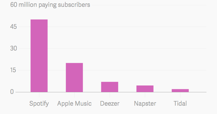 所以,虽然拥有5000万付费用户的Spotify发展潜力巨大,其商业模式仍然面临考验。2016年底,其董事会成员透露,Spotify将在2017年达到盈利的目标。不过,这是将要真实发生的事情,还是这家亏损已久的公司想给投资人吃的一颗定心丸,恐怕还需要时间和市场的验证。