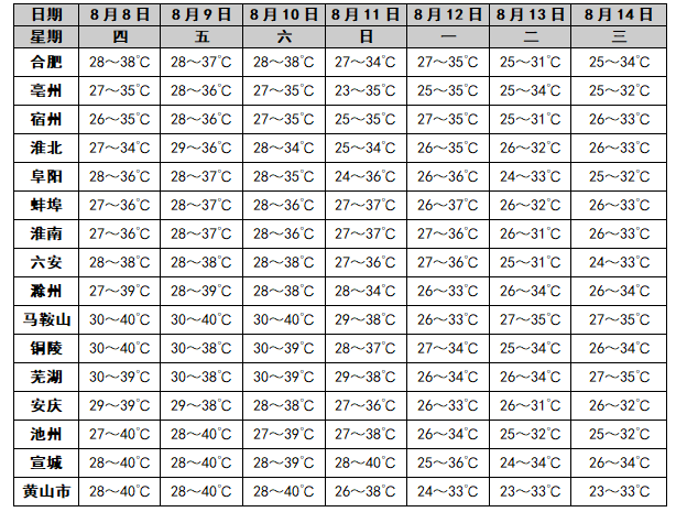 高温:11日前淮北地区南部和沿淮淮河以南有持续性高温天气,其中江淮之间最高气温37~39℃,沿江江南39~41℃,淮北地区北部33~36℃。12日后安徽省大部分地区高温天气逐渐缓解。13日至14日全省大部最高气温普遍在33℃以下。