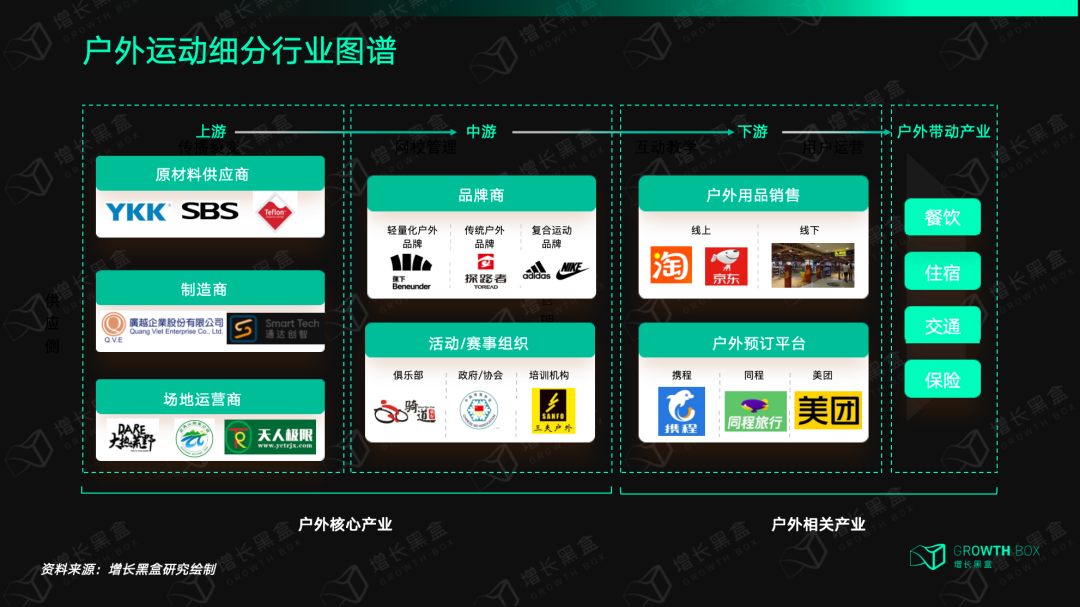 下游为产品销售及平台预订。过去国内户外运动产品的购买渠道非常有限,低端平价线被迪卡侬这家来自法国的户外用品零售商垄断,更多高端大牌产品不是买不到就是价格奇高。