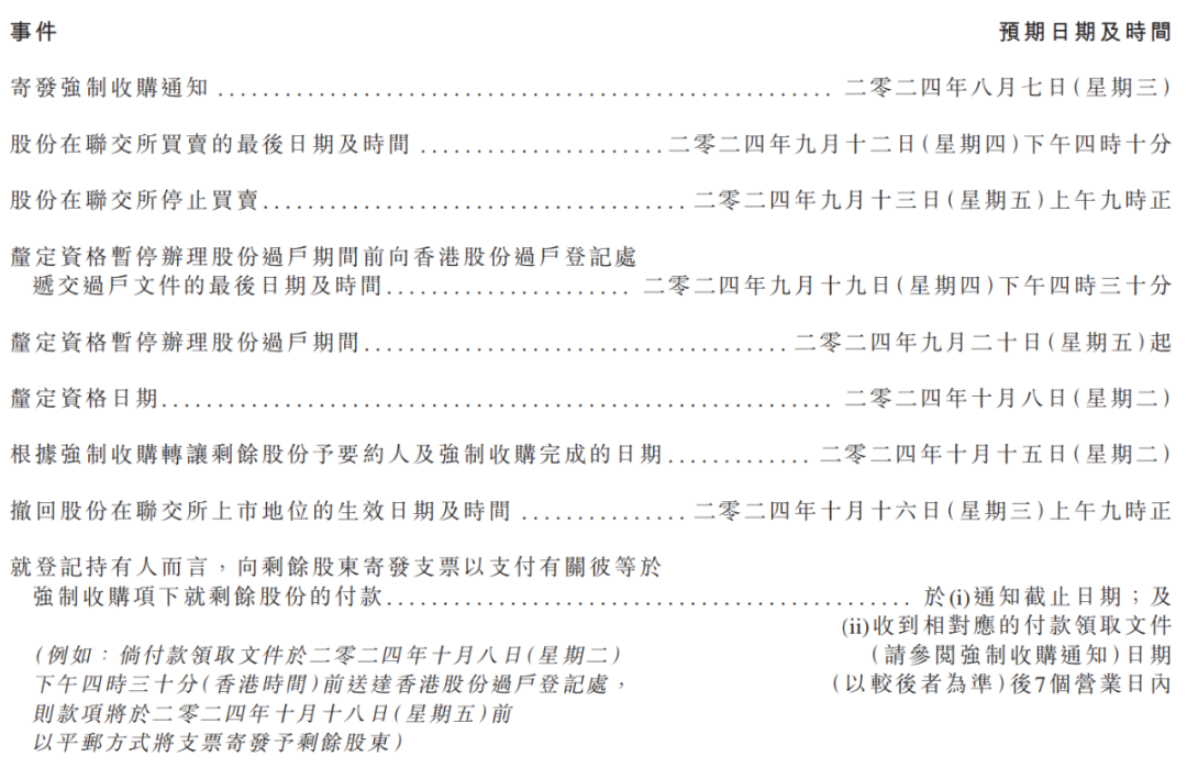 《强制收购通知》显示,除仍有争议的任何剩余股份外,所有剩余股份(已转让予要约人的股份除外)将于2024年10月15日被强制收购及转让予要约人。
