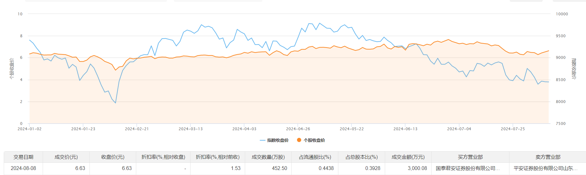 史丹利8月8日大宗交易成交452.5万股,成交额3000.08万元,占当日总成交额的32.34%,成交价6.63元,较市场收盘价6.63元持平。
