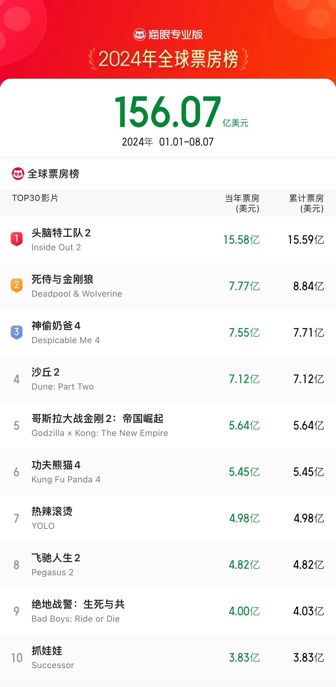 据猫眼专业版数据,电影《抓娃娃》中国大陆实时票房超28.04亿人民币,助《抓娃娃》进入2024年全球票房榜前十。
